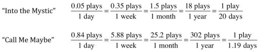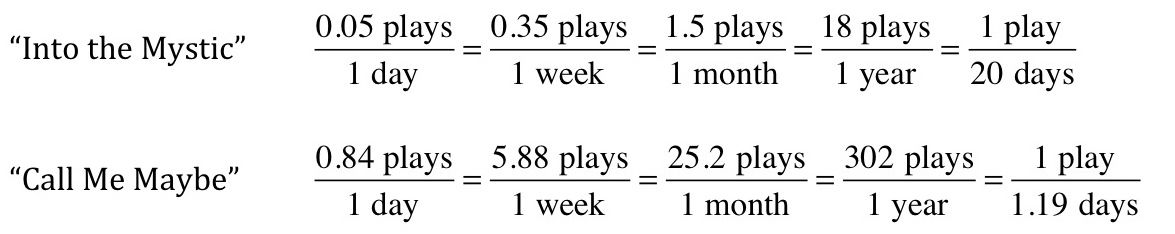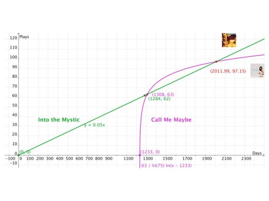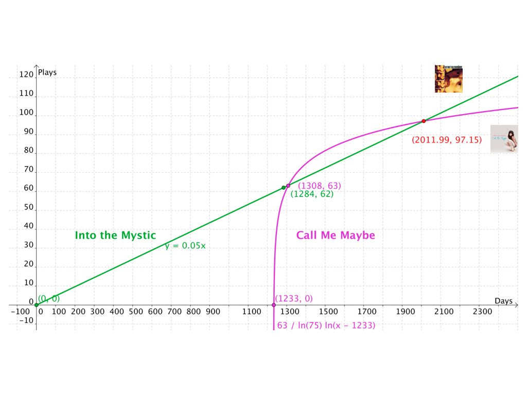 Comparing slopes is an obvious discussion topic. The line for “Call Me Maybe” is much steeper than the line for “Into the Mystic”; the rate of change is 0.84 plays/day versus 0.05 plays/day.