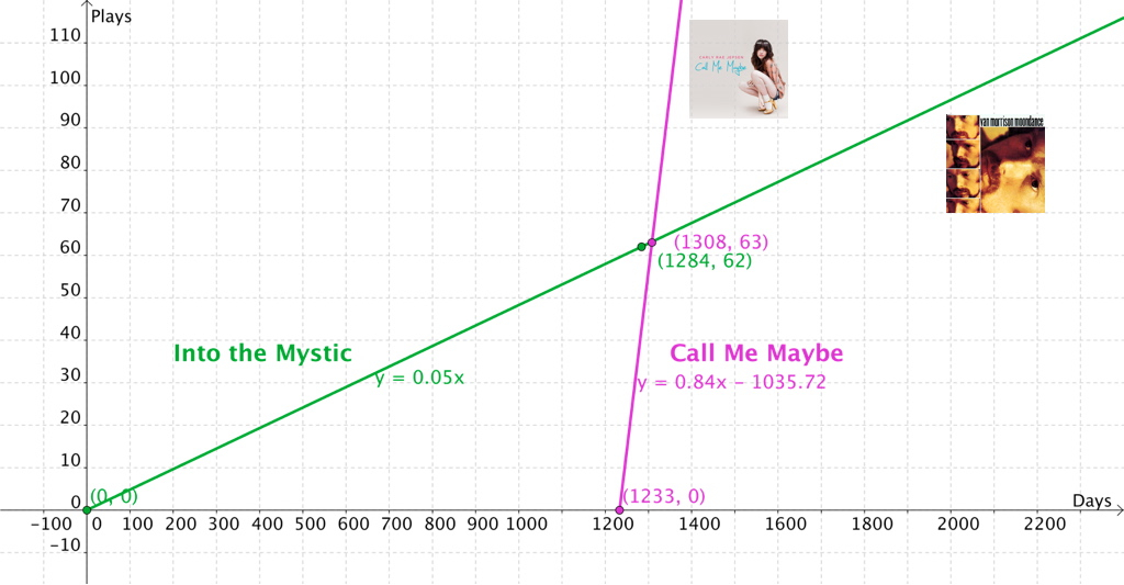 I assumed that this situation could be modelled using linear relations. For “Into the Mystic”, fair enough. I think this reasonably approximates the real data. Outside of perhaps when I was commenting on Michael Pershan’s blog, I didn’t go through a Van Morrison phase. Van Morrison is in my wheelhouse and “Into the Mystic” is just in the rotation. The number of plays per day is (almost) constant.