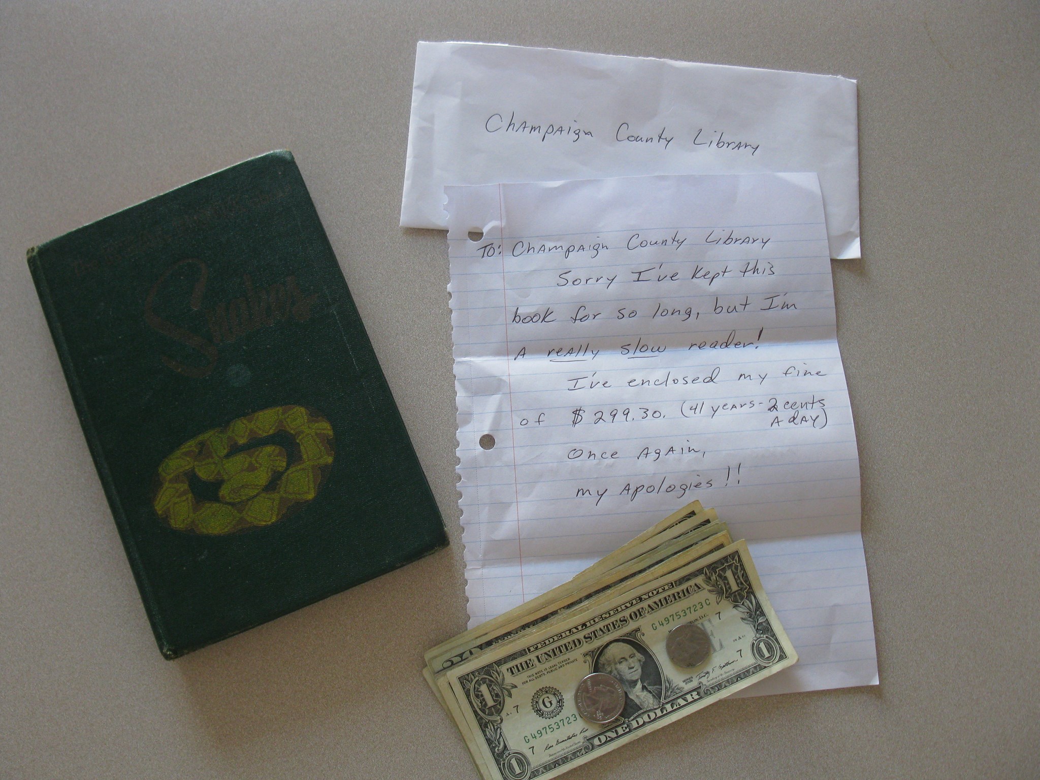 Earlier this year, a man returned “The Real Book of Snakes” 41 years late to a library in Ohio. He enclosed $299.30 — 2¢ a day for 41 years. Seems a tad light. Safe to say, the Champaign County Library does not charge two pennies a day in 2013. The Vancouver Public Library charges 25¢ a day. Let’s go with that. Two bits a day for 41 years works out to $3741.25. Seems a tad excessive.