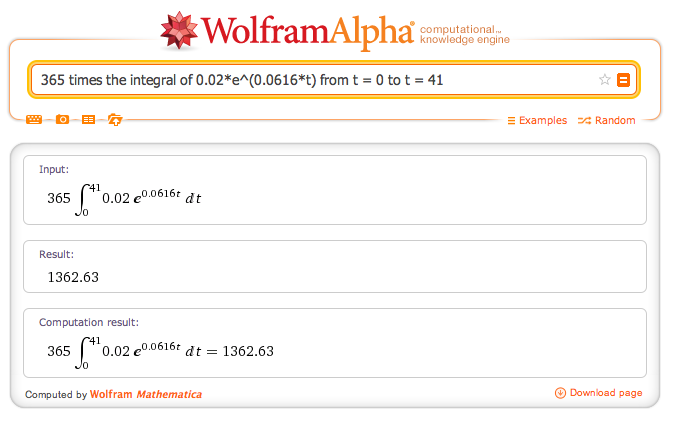 Instead, assuming the percentage increase is constant, an exponential function can be used (to approximate a step function). Solving 0.25 = 0.02*e^(r*41) for r gives r = 0.0616. Integrals, like overdue fines, have to do with change and the accumulation of change.