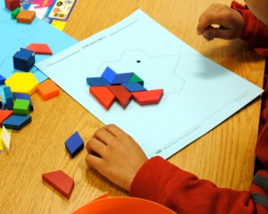 Cuisenaire rods give children hands-on ways to explore the meaning of fractions. After students built their towers, flowers, and robots, I asked, “If the orange rod is the whole, which rod is one half?” Students explained their thinking: “two yellows make an orange.” I emphasized, or rather, students emphasized that the two parts must be equal.