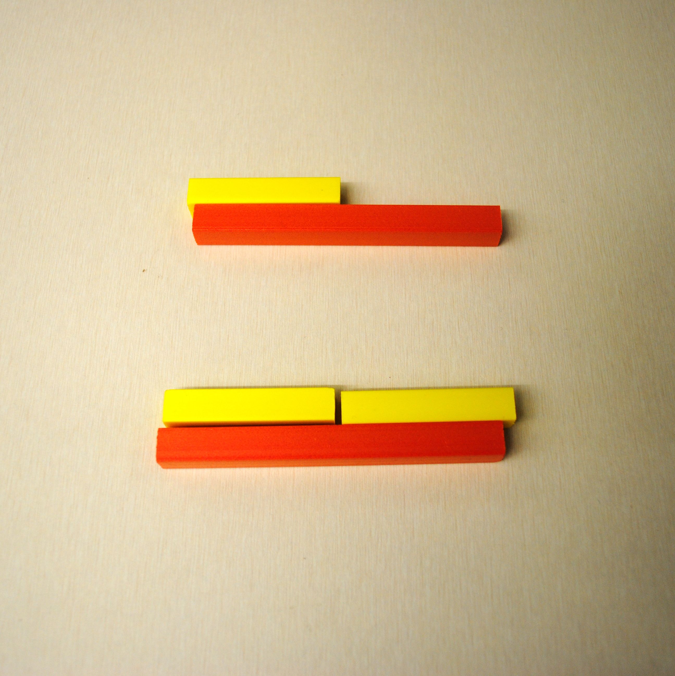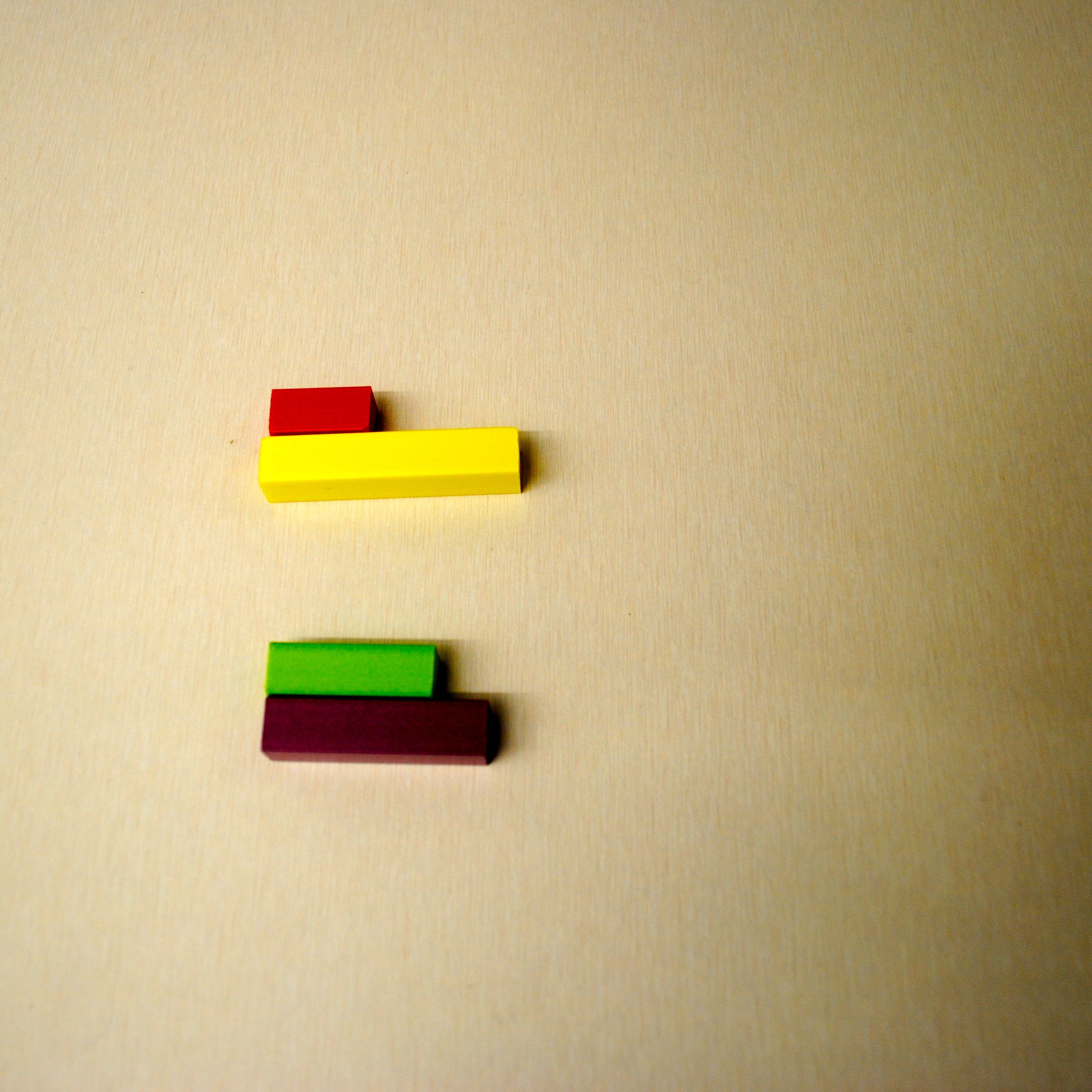 - the denominator tells how many equal parts make the whole (e.g., two purple rods make one brown rod, three light green rods make one blue rod)