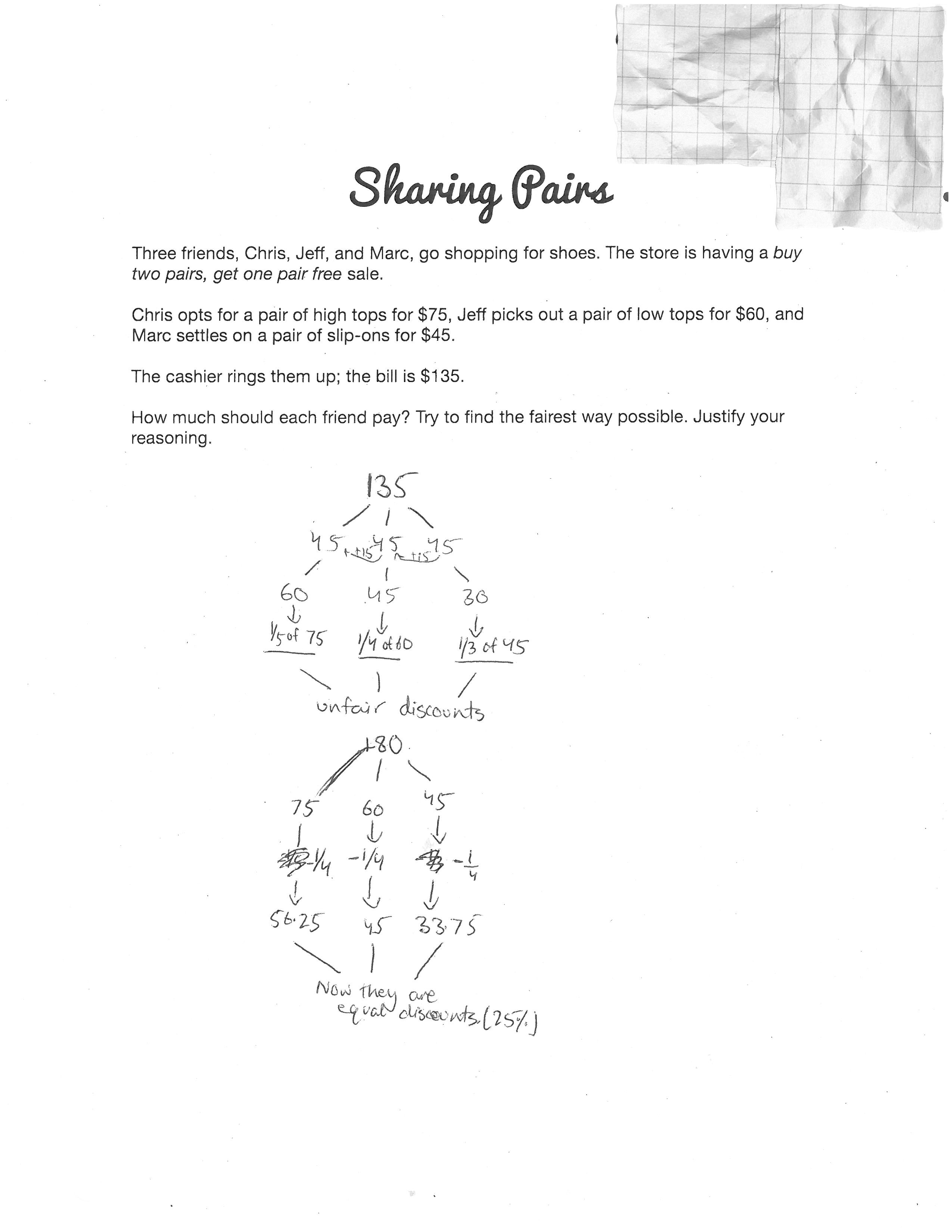 The most common initial approach was to divide the bill by three; each person pays $45. What’s more fair than same? I poked holes in their reasoning: “Is it fair for Marc to pay the same as Chris? Why? Why not?” Students notice that Chris is getting more shoe for his buck. Also, Marc is being cheated of any discount, as described by Student A. (This wasn’t a happy accident; it’s the reason why I chose the ratio 5:4:3.)